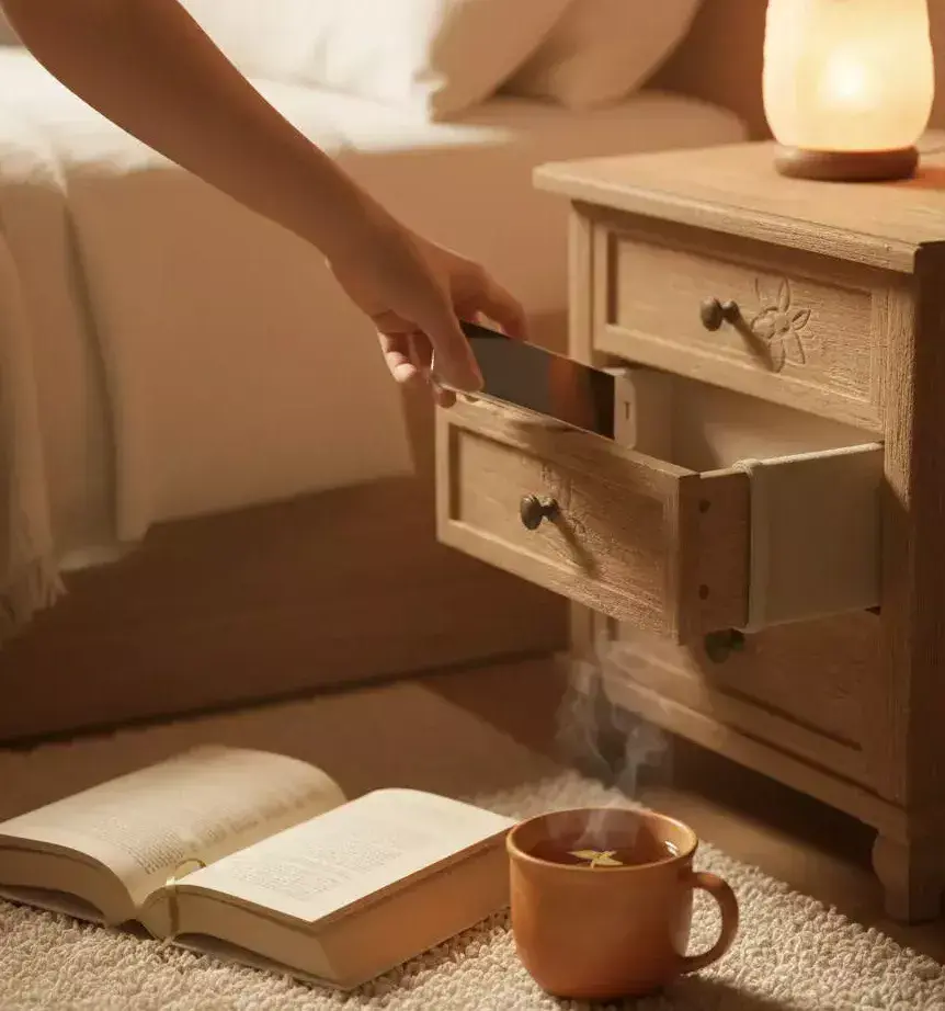 - Световая детоксикация (правило 1–2 часов). Яркие экраны гаджетов увеличивают возбудимость нервной системы и мешают заснуть. Синий свет блокирует выработку мелатонина. Уберите телефон за 1–2 часа до сна — это самый эффективный ответ на вопрос «как быстро уснуть».