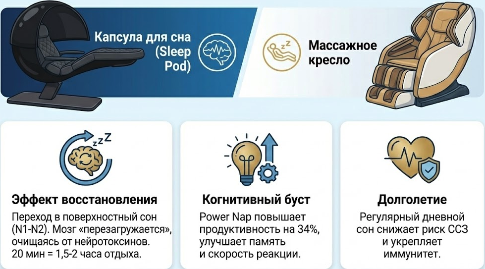Сценарий «Стратегическая Пауза»: В середине дня, почувствовав когнитивный спад, вместо очередной чашки кофе (или, что хуже, алкоголя вечером) лидер ложится в капсулу для сна. 20 минут в режиме Power Nap полностью восстанавливают нейроресурс. Он выходит из капсулы свежим, готовым к сложным переговорам, без тумана в голове, который оставил бы массаж или простой сон на диване.